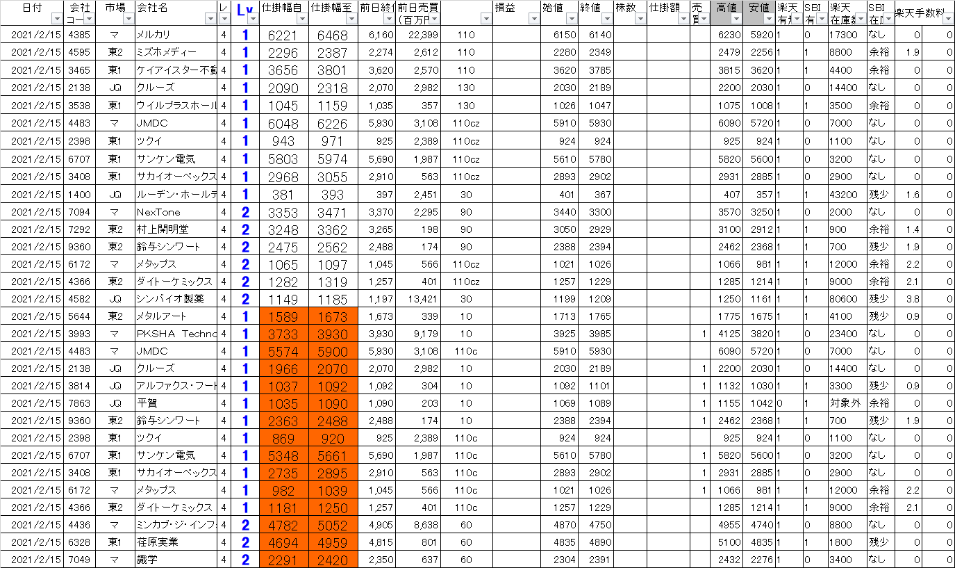 ※仕掛け表中の背景色がオレンジの行は【買い仕掛け】の対象銘柄で、データ収集のためのものです。(仕掛表について詳しくはこちらを)