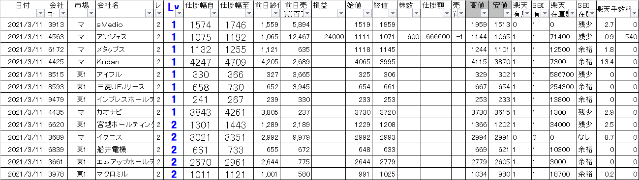 CD | 市場 | 会社名 | Lv | 仕掛幅自 | 仕掛幅至 | 始値 | 終値 | 株数 | 損益 | 楽天在庫 | 空売手数 | SBI在庫 |