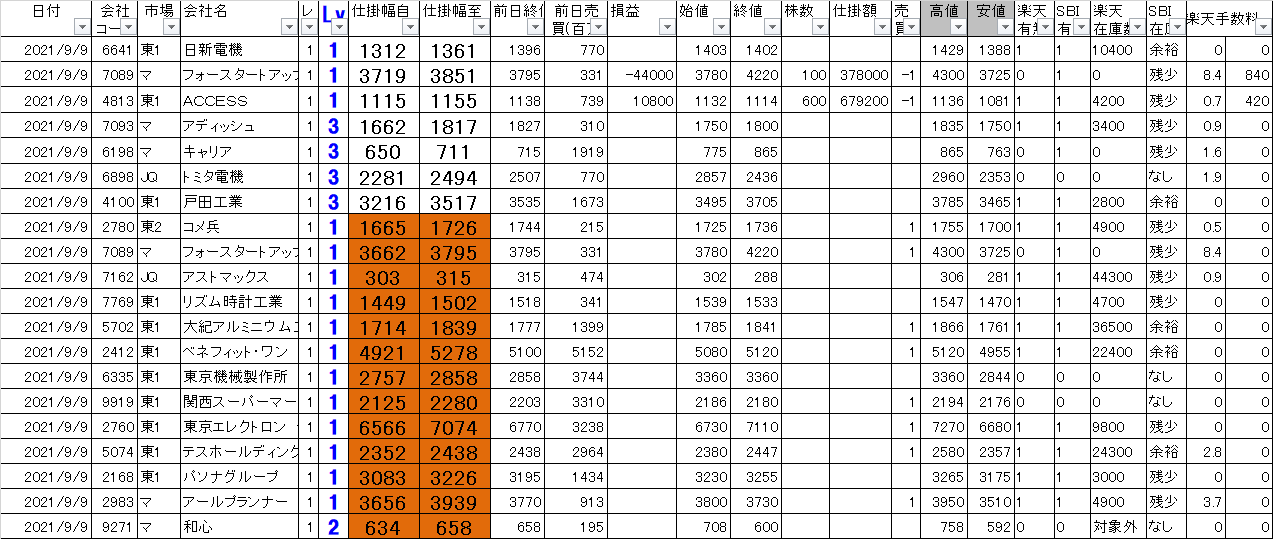 CD | 市場 | 会社名 | 仕掛幅自 | 仕掛幅至 | 始値 | 終値 | 株数 | 損益 | 楽天在庫 | 空売手数 | SBI在庫 |