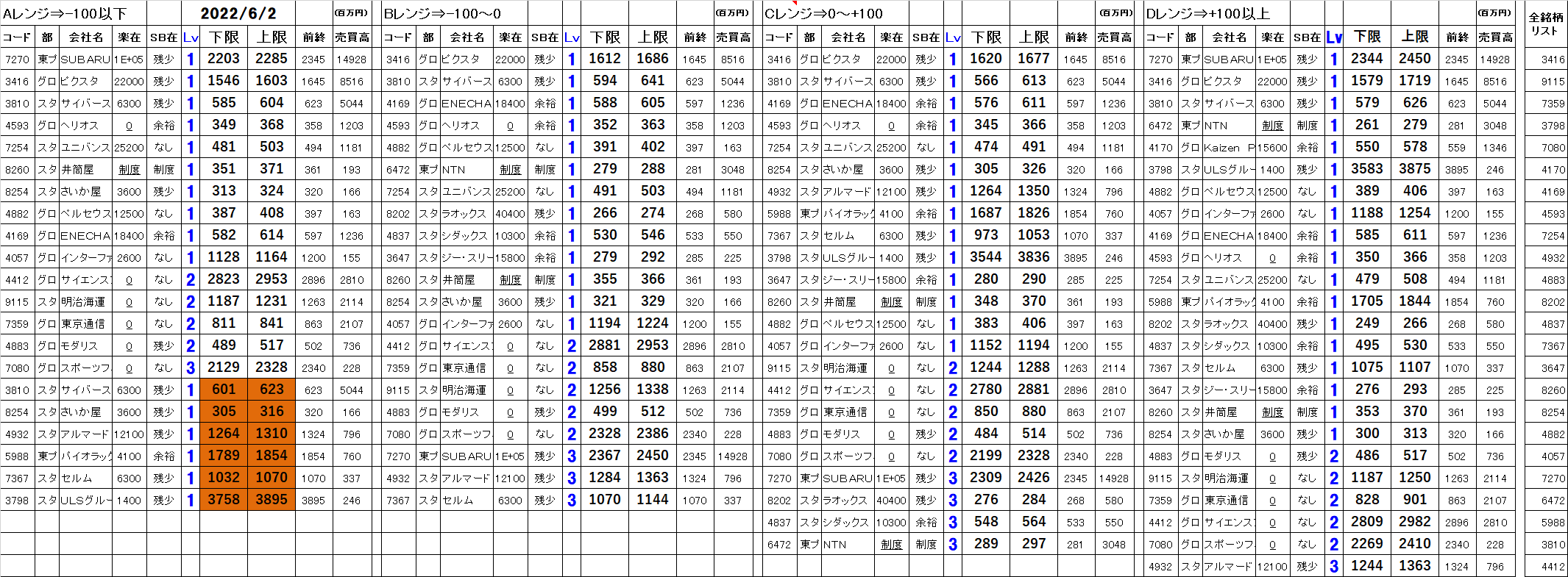 [Aレンジ:-100円以下][Bレンジ:-100円~±0][Cレンジ:±0~+100円][Dレンジ:+100円以上]