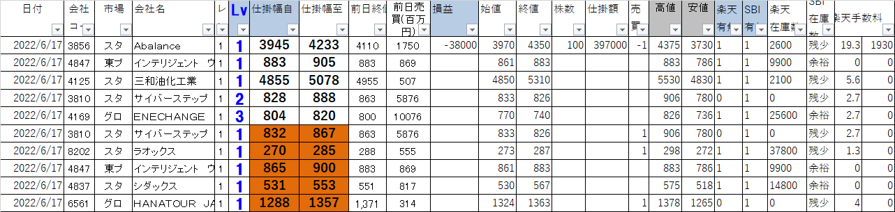 CD | 市場 | 会社名 | 仕掛幅自 | 仕掛幅至 | 始値 | 終値 | 株数 | 損益 | 楽天在庫 | 空売手数 | SBI在庫 |