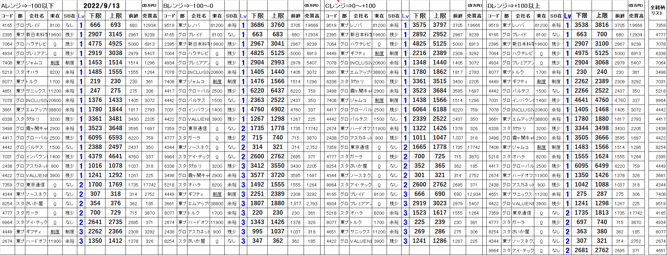 2022年9月13日 のシステムトレードの仕掛候補一覧はこんな感じです。