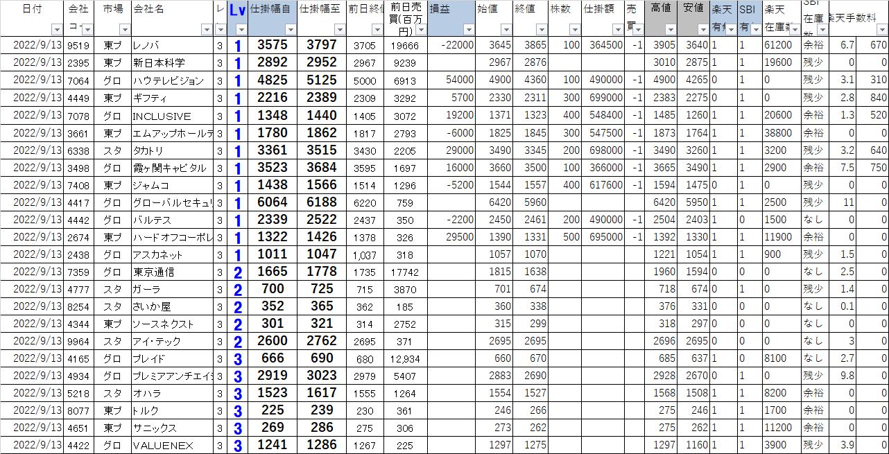 CD | 市場 | 会社名 | 仕掛幅自 | 仕掛幅至 | 始値 | 終値 | 株数 | 損益 | 楽天在庫 | 空売手数 | SBI在庫 |