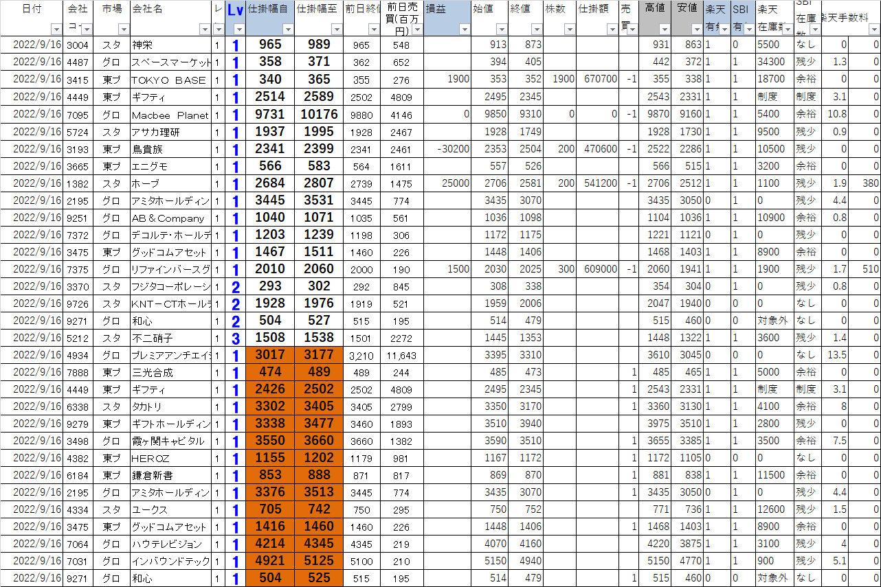 市場会社名仕掛幅自仕掛幅至始値終値株数損益楽天在庫空売手数SBI在庫