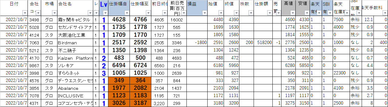 CD | 市場 | 会社名 | 仕掛幅自 | 仕掛幅至 | 始値 | 終値 | 株数 | 損益 | 楽天在庫 | 空売手数 | SBI在庫 |