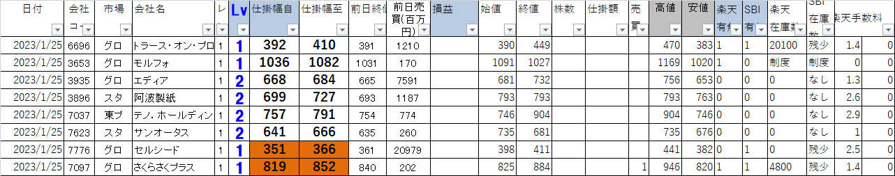 市場会社名仕掛幅自仕掛幅至始値終値株数損益楽天在庫空売手数SBI在庫