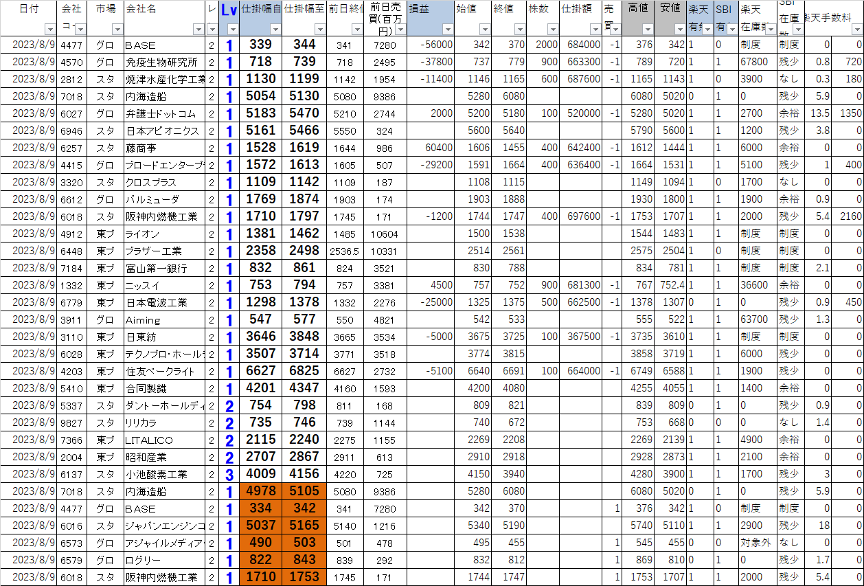 CD | 市場 | 会社名 | 仕掛幅自 | 仕掛幅至 | 始値 | 終値 | 株数 | 損益 | 楽天在庫 | 空売手数 | SBI在庫 |