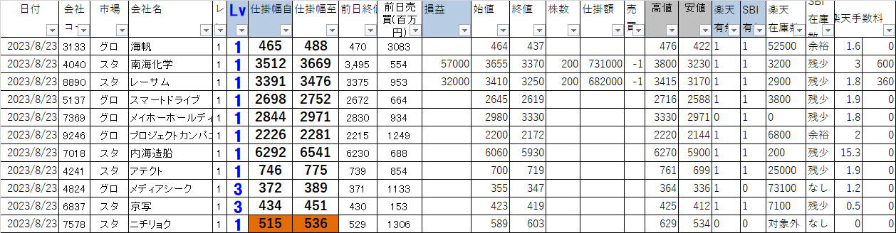 CD | 市場 | 会社名 | 仕掛幅自 | 仕掛幅至 | 始値 | 終値 | 株数 | 損益 | 楽天在庫 | 空売手数 | SBI在庫 |