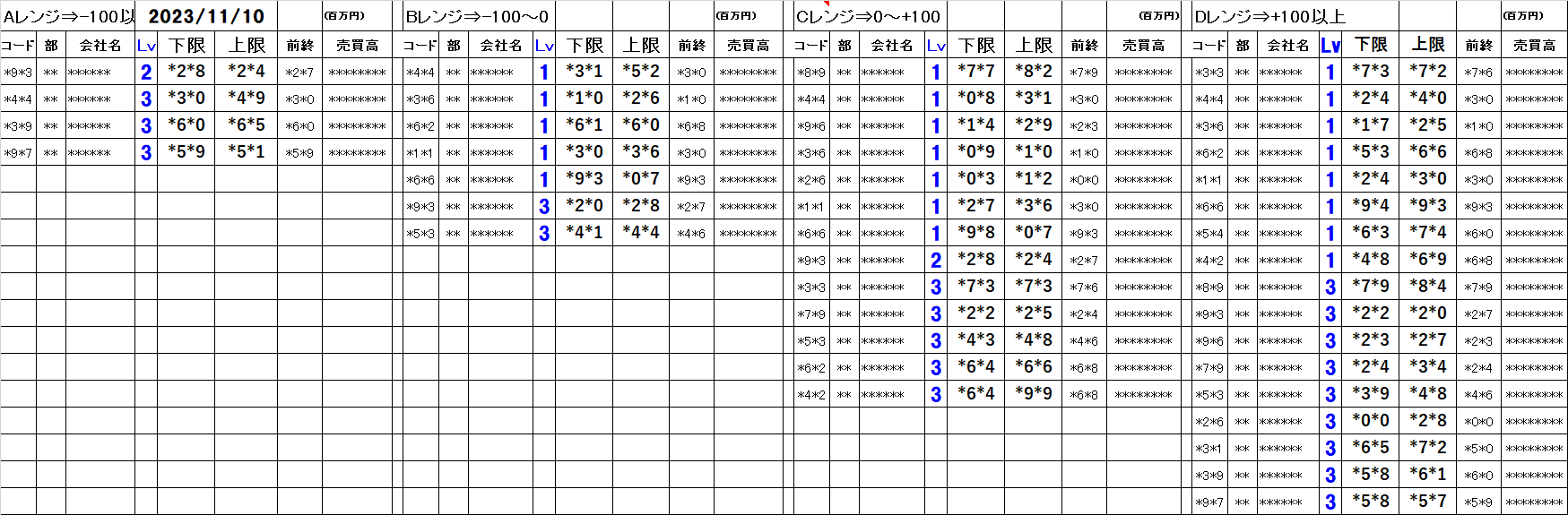 2023年11月10日 のシステムトレードの仕掛候補一覧はこんな感じです。