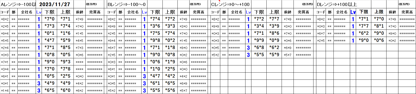2023年11月27日 のシステムトレードの仕掛候補一覧はこんな感じです。