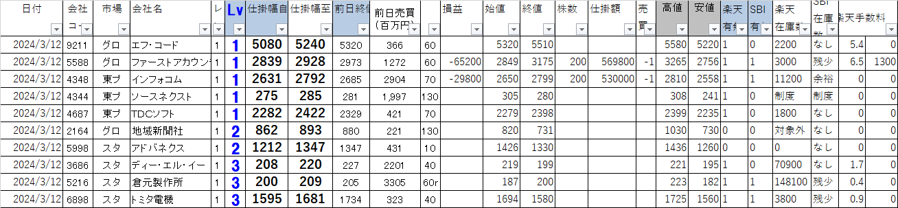 CD | 市場 | 会社名 | 仕掛幅自 | 仕掛幅至 | 始値 | 終値 | 株数 | 損益 | 楽天在庫 | 空売手数 | SBI在庫 |