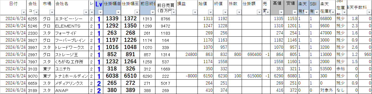 市場会社名仕掛幅自仕掛幅至始値終値株数損益楽天在庫空売手数SBI在庫