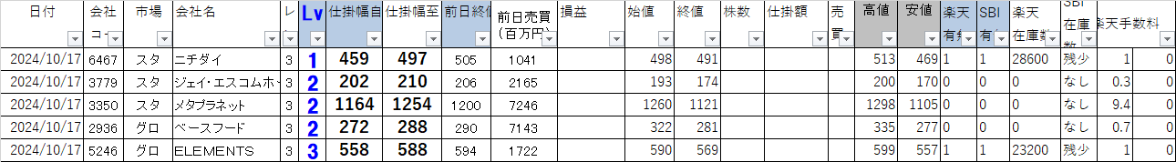 市場会社名仕掛幅自仕掛幅至始値終値株数損益楽天在庫空売手数SBI在庫