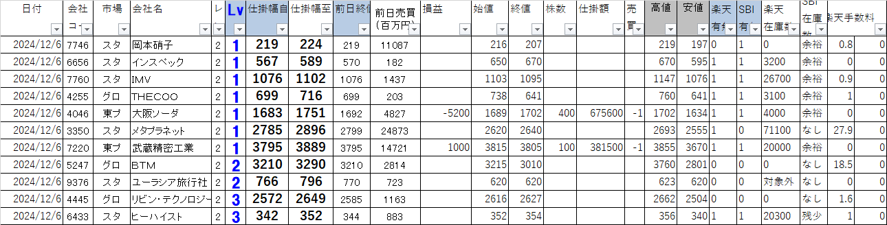 市場 | 会社名 | 仕掛幅自 | 仕掛幅至 | 始値 | 終値 | 株数 | 損益 | 楽天在庫 | 空売手数 | SBI在庫 |