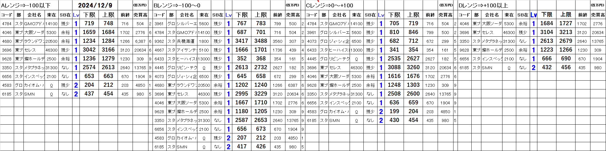 2024年12月9日 今日のシステムトレードの仕掛候補一覧です。