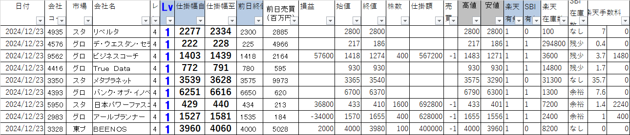 市場 | 会社名 | 仕掛幅自 | 仕掛幅至 | 始値 | 終値 | 株数 | 損益 | 楽天在庫 | 空売手数 | SBI在庫 |