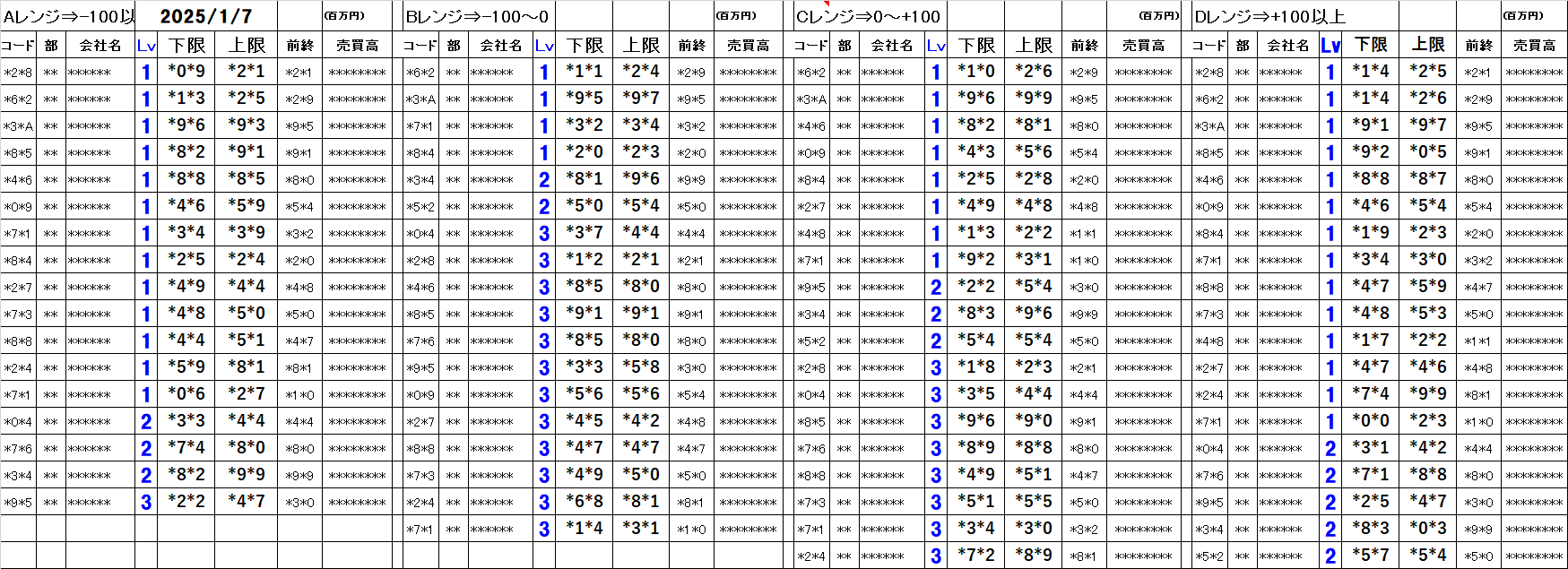 2025年1月7日 のシステムトレードの仕掛候補一覧はこんな感じです。
