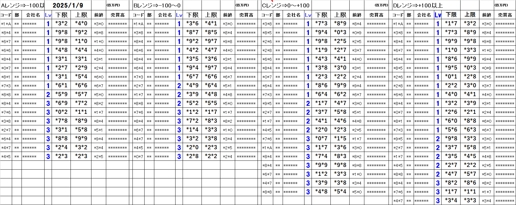 2025年1月9日 のシステムトレードの仕掛候補一覧はこんな感じです。