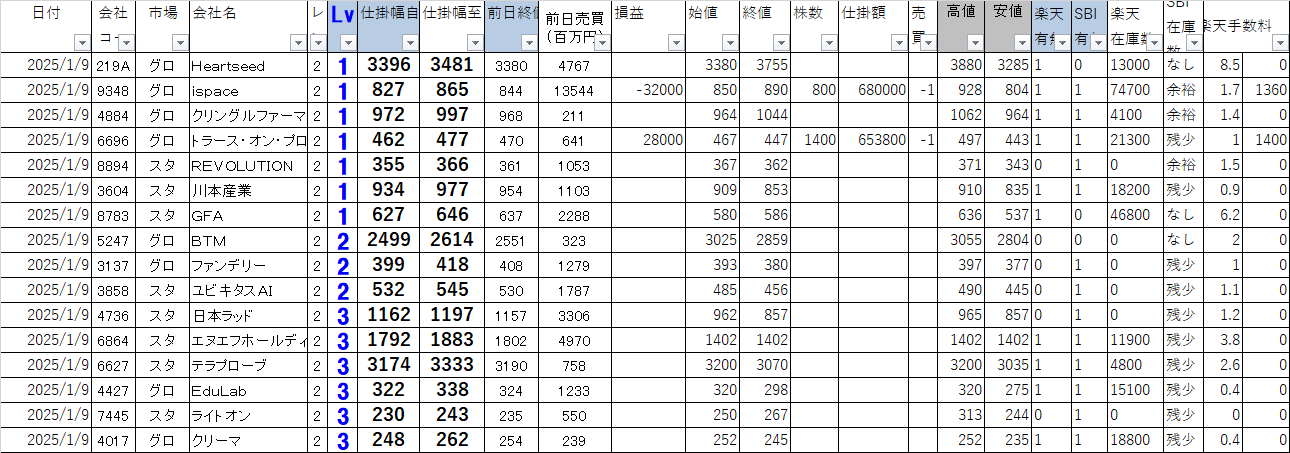 市場 | 会社名 | 仕掛幅自 | 仕掛幅至 | 始値 | 終値 | 株数 | 損益 | 楽天在庫 | 空売手数 | SBI在庫 |