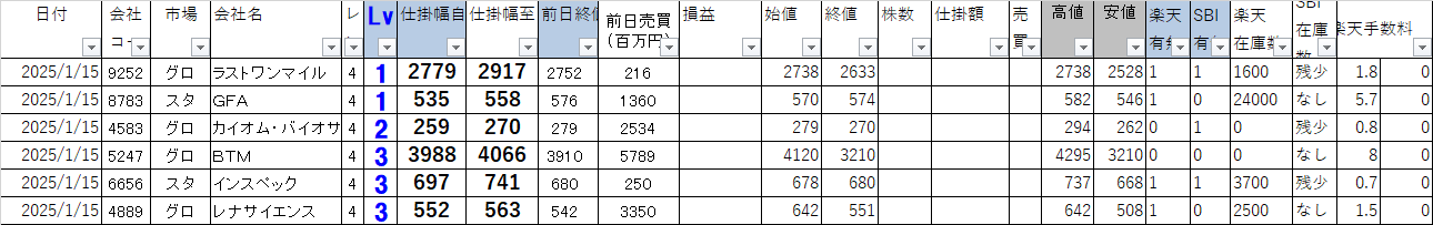 市場 | 会社名 | 仕掛幅自 | 仕掛幅至 | 始値 | 終値 | 株数 | 損益 | 楽天在庫 | 空売手数 | SBI在庫 |