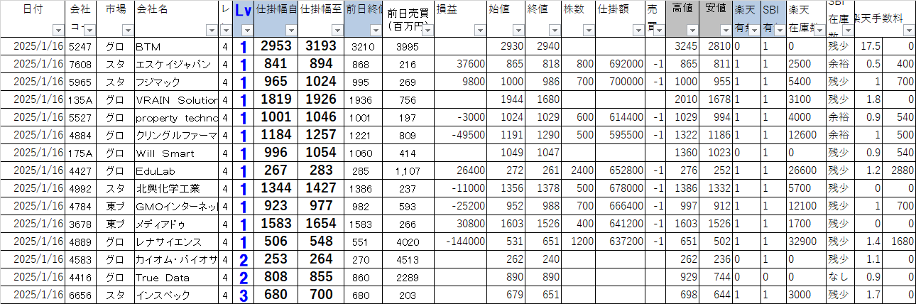 市場 | 会社名 | 仕掛幅自 | 仕掛幅至 | 始値 | 終値 | 株数 | 損益 | 楽天在庫 | 空売手数 | SBI在庫 |
