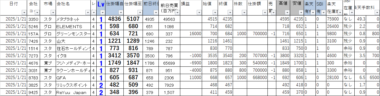 市場 会社名 仕掛幅自 仕掛幅至 始値 終値 株数 損益 楽天在庫 空売手数 SBI在庫