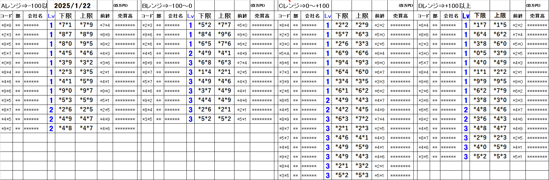 2025年1月22日 のシステムトレードの仕掛候補一覧はこんな感じです。
