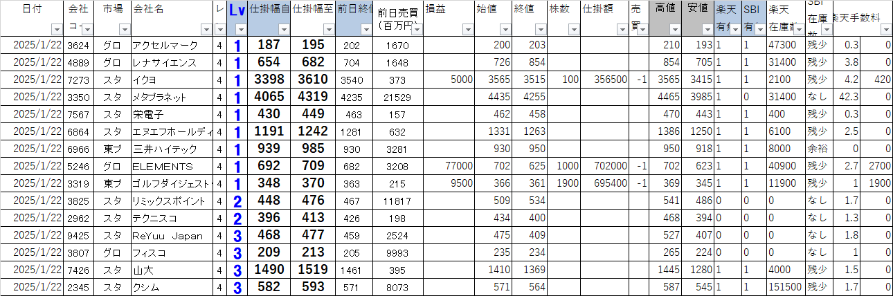 市場 | 会社名 | 仕掛幅自 | 仕掛幅至 | 始値 | 終値 | 株数 | 損益 | 楽天在庫 | 空売手数 | SBI在庫 |