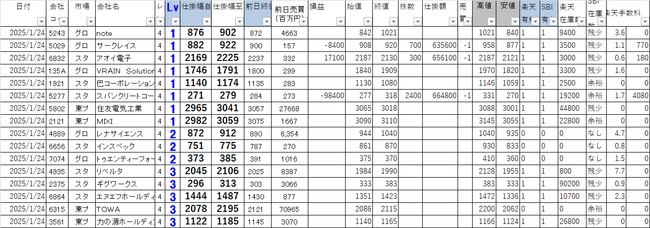 市場 | 会社名 | 仕掛幅自 | 仕掛幅至 | 始値 | 終値 | 株数 | 損益 | 楽天在庫 | 空売手数 | SBI在庫 |