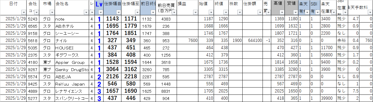 市場 | 会社名 | 仕掛幅自 | 仕掛幅至 | 始値 | 終値 | 株数 | 損益 | 楽天在庫 | 空売手数 | SBI在庫 |