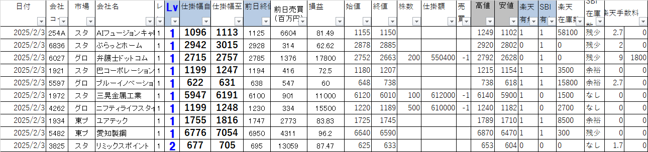 市場 | 会社名 | 仕掛幅自 | 仕掛幅至 | 始値 | 終値 | 株数 | 損益 | 楽天在庫 | 空売手数 | SBI在庫 |