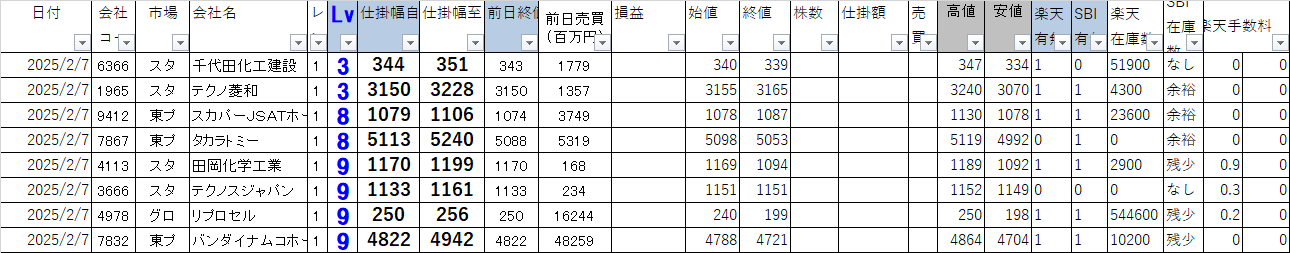 市場 | 会社名 | 仕掛幅自 | 仕掛幅至 | 始値 | 終値 | 株数 | 損益 | 楽天在庫 | 空売手数 | SBI在庫 |