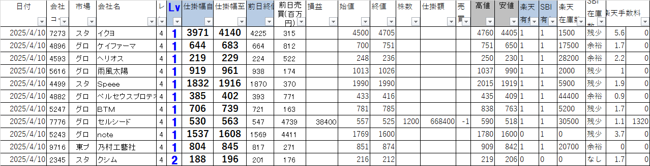 市場 会社名 仕掛幅自 仕掛幅至 始値 終値 株数 損益 楽天在庫 空売手数 SBI在庫