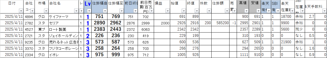 市場 | 会社名 | 仕掛幅自 | 仕掛幅至 | 始値 | 終値 | 株数 | 損益 | 楽天在庫 | 空売手数 | SBI在庫 |