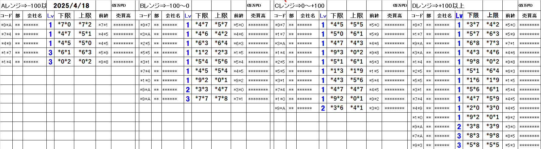 2025年4月18日 のシステムトレードの仕掛候補一覧はこんな感じです。