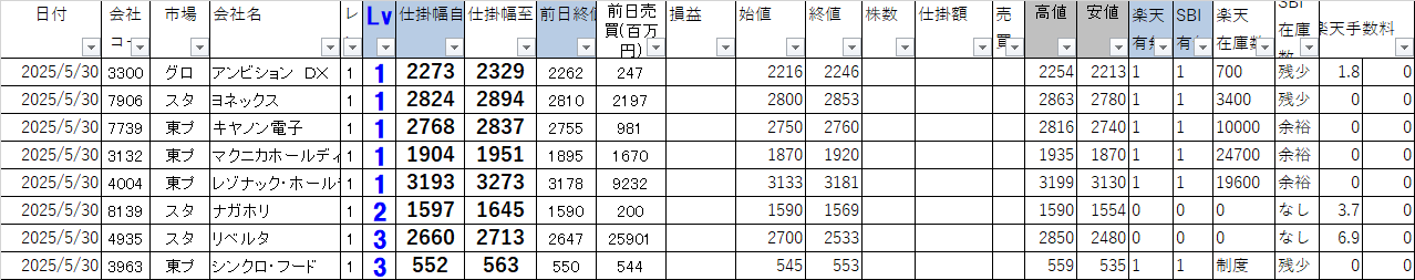 市場 | 会社名 | 仕掛幅自 | 仕掛幅至 | 始値 | 終値 | 株数 | 損益 | 楽天在庫 | 空売手数 | SBI在庫 |