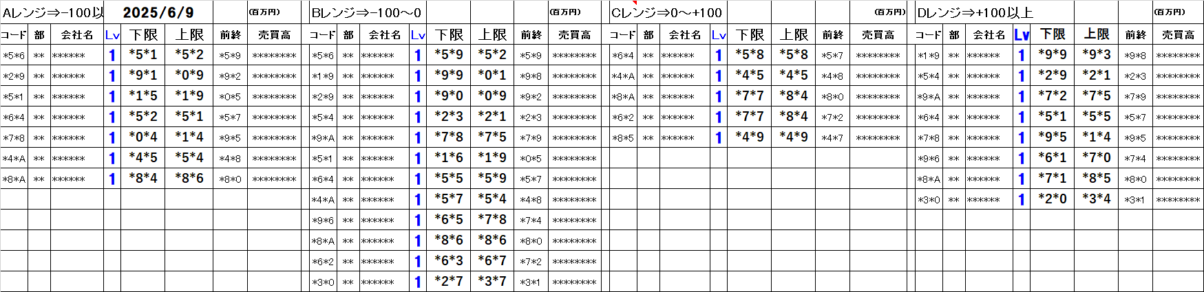 2025年6月9日 のシステムトレードの仕掛候補一覧はこんな感じです。
