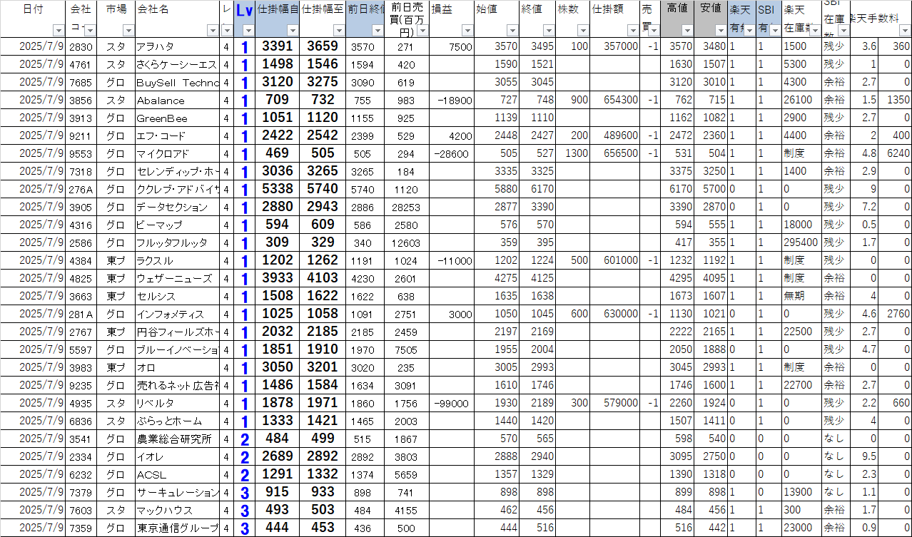 市場 | 会社名 | 仕掛幅自 | 仕掛幅至 | 始値 | 終値 | 株数 | 損益 | 楽天在庫 | 空売手数 | SBI在庫 |