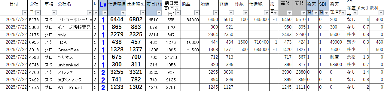 市場 | 会社名 | 仕掛幅自 | 仕掛幅至 | 始値 | 終値 | 株数 | 損益 | 楽天在庫 | 空売手数 | SBI在庫 |
