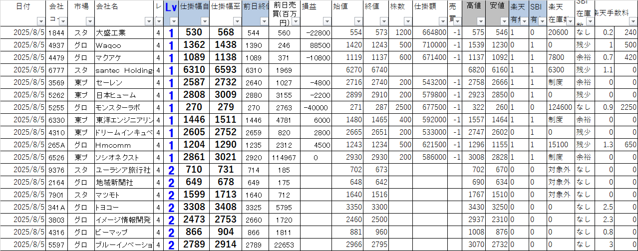 市場 | 会社名 | 仕掛幅自 | 仕掛幅至 | 始値 | 終値 | 株数 | 損益 | 楽天在庫 | 空売手数 | SBI在庫 |