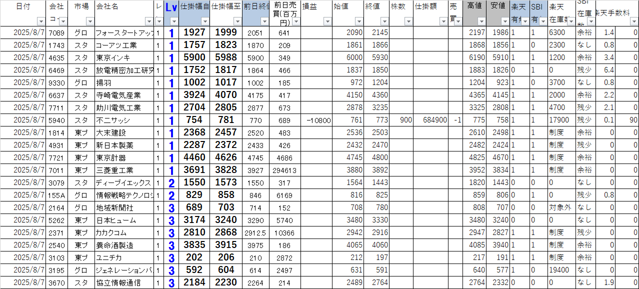 市場 | 会社名 | 仕掛幅自 | 仕掛幅至 | 始値 | 終値 | 株数 | 損益 | 楽天在庫 | 空売手数 | SBI在庫 |