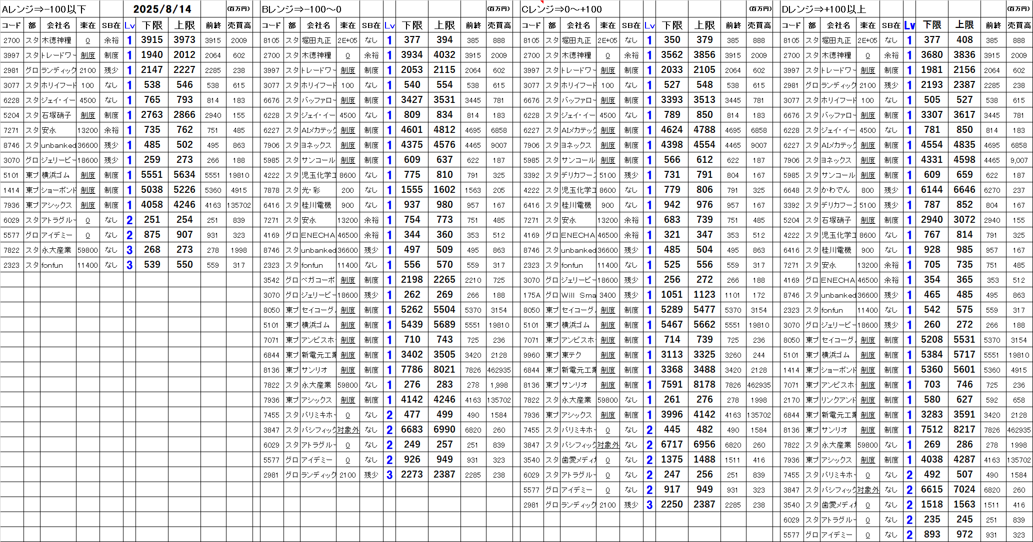 2025年8月14日 今日のシステムトレードの仕掛候補一覧です。