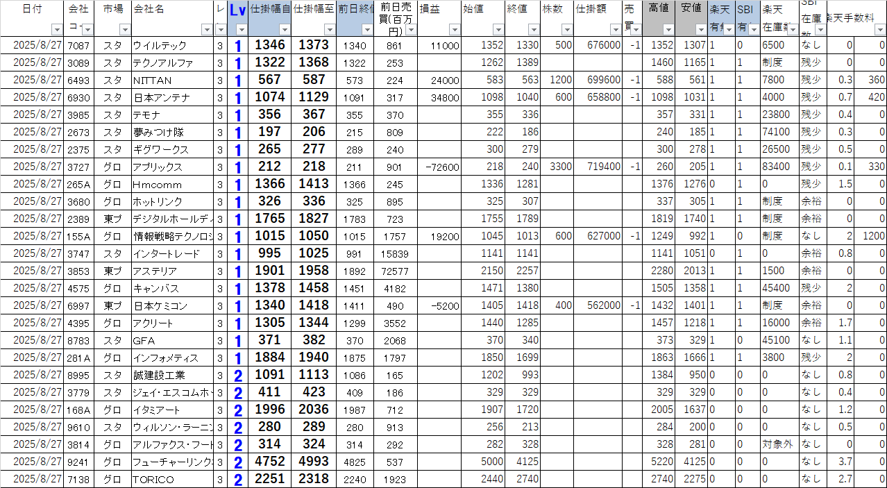市場 | 会社名 | 仕掛幅自 | 仕掛幅至 | 始値 | 終値 | 株数 | 損益 | 楽天在庫 | 空売手数 | SBI在庫 |