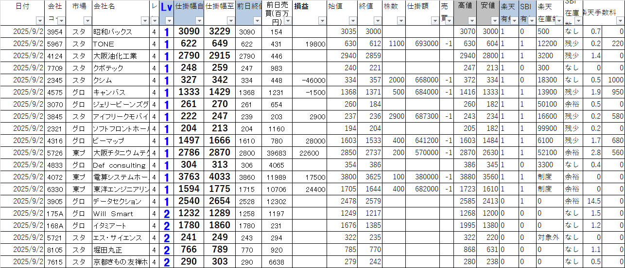市場 | 会社名 | 仕掛幅自 | 仕掛幅至 | 始値 | 終値 | 株数 | 損益 | 楽天在庫 | 空売手数 | SBI在庫 |