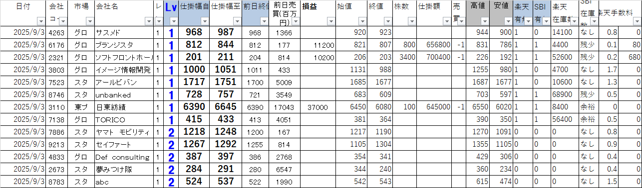 市場 | 会社名 | 仕掛幅自 | 仕掛幅至 | 始値 | 終値 | 株数 | 損益 | 楽天在庫 | 空売手数 | SBI在庫 |
