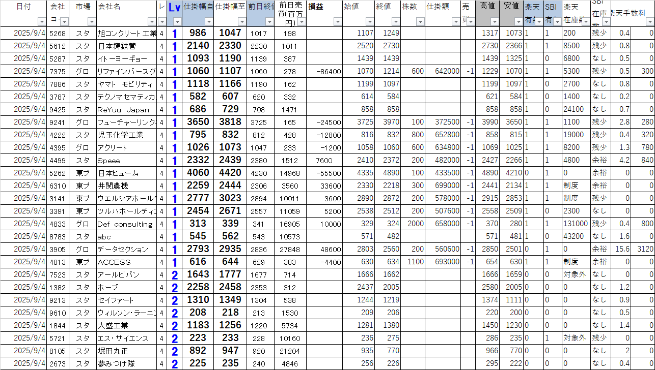 市場 | 会社名 | 仕掛幅自 | 仕掛幅至 | 始値 | 終値 | 株数 | 損益 | 楽天在庫 | 空売手数 | SBI在庫 |