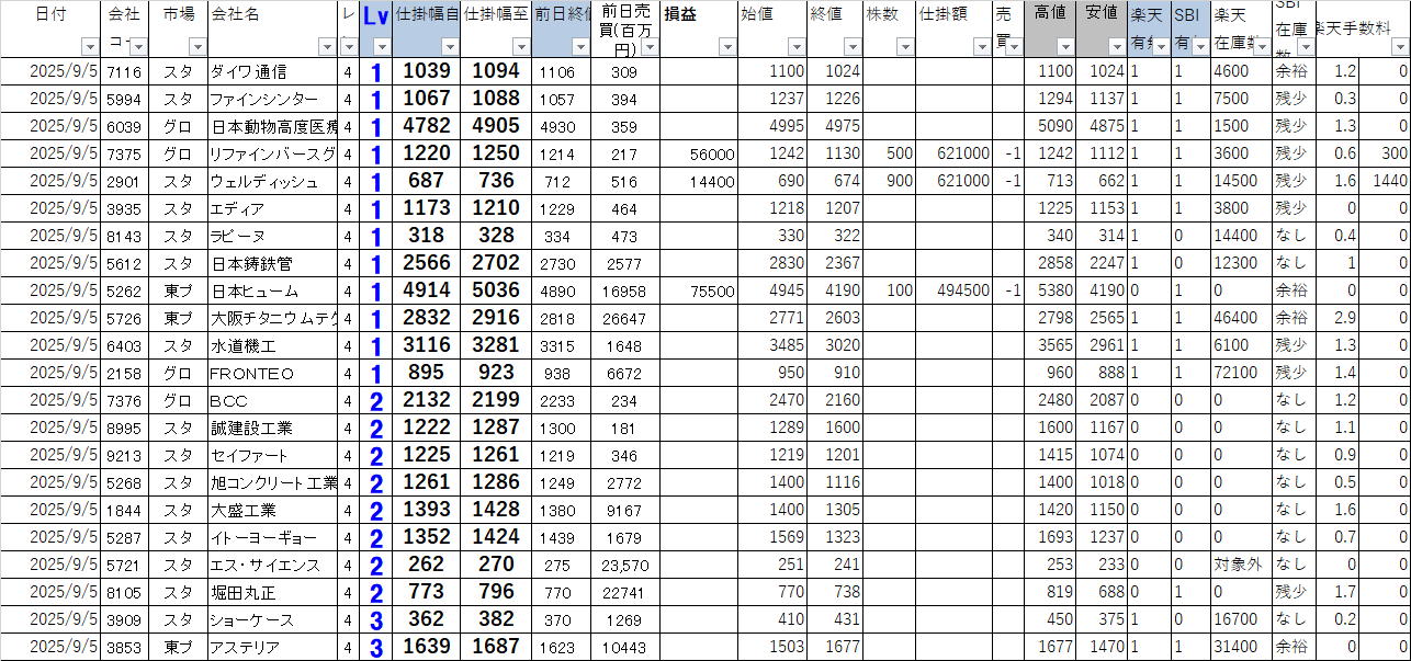 市場 | 会社名 | 仕掛幅自 | 仕掛幅至 | 始値 | 終値 | 株数 | 損益 | 楽天在庫 | 空売手数 | SBI在庫 |
