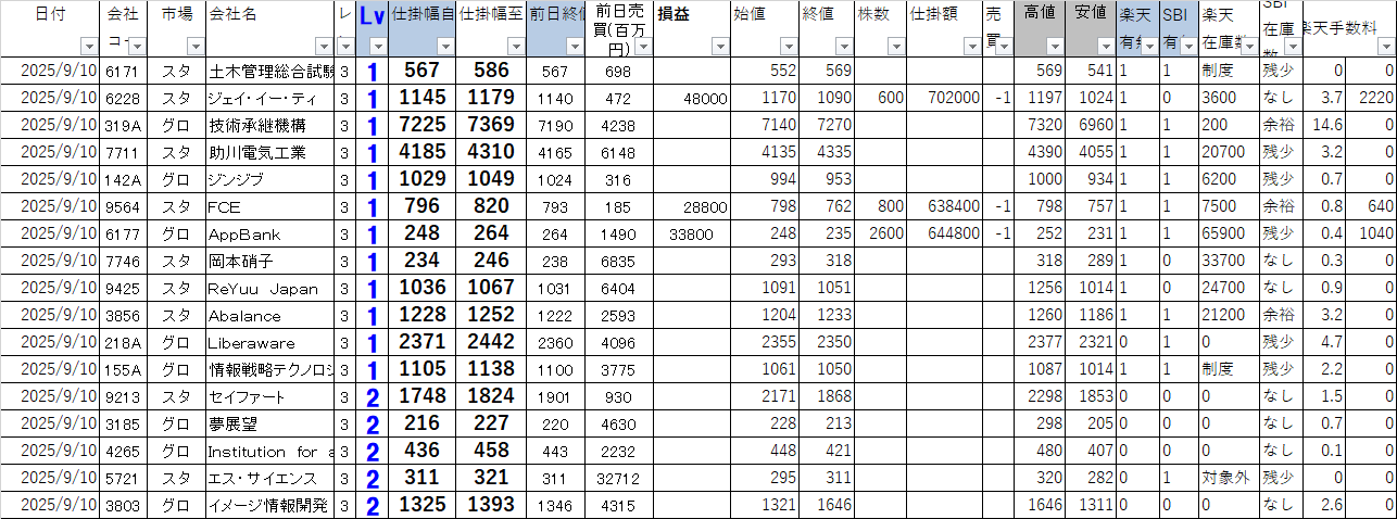 市場 会社名 仕掛幅自 仕掛幅至 始値 終値 株数 損益 楽天在庫 空売手数 SBI在庫